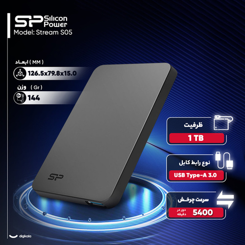 هارد اکسترنال سیلیکون پاور Stream S05 با ظرفیت یک ترابایت طراحی شده تا کاربران تجربه‌ای ساده، سریع و قابل حمل از ذخیره‌سازی داده‌ها داشته باشند. بدنه دستگاه از پلاستیک مات ساخته شده که مقاومت بالایی در برابر خط و خش و گرد و غبار دارد و اثرانگشت روی آن باقی نمی‌ماند، بنابراین ظاهر هارد همواره تمیز و مرتب باقی می‌ماند. وزن سبک 144 گرمی و ابعاد کوچک 126.5x79.8x15 میلی‌متر، حمل و نقل آن را آسان کرده و اجازه می‌دهد در کیف لپ‌تاپ یا کوله‌پشتی قرار گیرد. فرم فکتور 2.5 اینچی و سرعت چرخش 5400 دور در دقیقه، انتقال داده‌ها را با ثبات و سرعت مناسب ممکن کرده است. رابط USB 3.0 Gen 1، حداکثر سرعت انتقال تا پنج گیگابیت بر ثانیه را ارائه می‌دهد که نسبت به نسل قبل تا ده برابر سریع‌تر است و مدیریت فایل‌های حجیم و پشتیبان‌گیری از داده‌ها را آسان می‌کند. نشانگر LED روی هارد، وضعیت فعالیت و انتقال اطلاعات را نمایش می‌دهد و کاربر می‌تواند بدون نگرانی از عملکرد صحیح دستگاه، آن را به سیستم وصل یا جدا کند. Stream S05 با دستگاه‌های مختلف شامل کامپیوتر و لپ‌تاپ‌های ویندوز و مک، تبلت و گوشی موبایل سازگار است و از سیستم‌عامل‌های Windows، Mac OS و Linux پشتیبانی می‌کند. اقلام همراه شامل کابل USB و دفترچه راهنما، نصب و راه‌اندازی هارد را ساده کرده و نیاز به تجهیزات جانبی اضافی را از بین می‌برد. در مجموع، سیلیکون پاور Stream S05 با ترکیبی از بدنه مقاوم، وزن سبک، سرعت مناسب و ابعاد جمع‌وجور، گزینه‌ای کاربردی و قابل اعتماد برای کاربران عادی و حرفه‌ای محسوب می‌شود و تجربه‌ای راحت و مطمئن از ذخیره‌سازی داده‌ها ارائه می‌دهد.